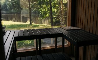 There is also a wood-burning sauna with a panoramic window in the steam room and bath tubs located on the banks of the Shuya River. As well as fishing, bicycles, badminton, table tennis, trampoline, playground and ball games, campfire area, pier, fishing rods, swings overlooking the river, board games - all this is already included in the price and is available to our guests.