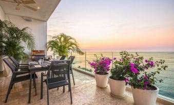 Open a glass wall to the mosaic-tiled private pool overlooking miles of blue ocean. This 2-story penthouse is 5380 sq. ft. of stunning luxury. Exquisite design like polished stone floors, 2 gourmet kitchens, and plush sink-in couches offer 24/7 paradise. Shaded patio with BBQ on the lower floor and full sun patio with Private pool on the upper floor. Breathtaking ocean & Banderas Bay view from patio on both levels.