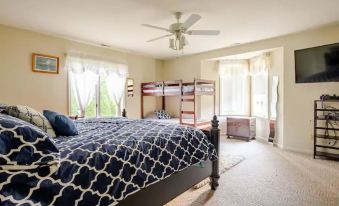 Home: Spacious living room, one bathroom, fully-equipped kitchen, outside and inside dining room, barbecue grill and a large deck looking towards the water and beautiful views on the main floor. Upstairs, the master bed is custom and twice the size of a king bed, couch, and private bathroom. There is a king bed and bunk bed in the second bedroom with a private bathroom. In the third bedroom, there is a queen bed that shares a bathroom with the fourth bedroom with a queen bed and a bunk bed. There is an air mattress available and plenty of space downstairs and upstairs for mattresses on the floor as well.