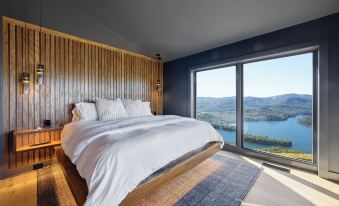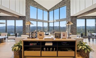 - Floor-to-ceiling glass walls with 270-degree lake and mountain vistas