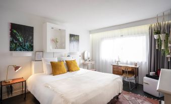 L'albergo è in uno stile rinnovato, giovane e moderno rispetto alla stessa struttura di alcuni anni fa. Personale disponibile giovane e gentile. Camere comode, bagno con doccia (su vasca), lavandino spazioso e superficie di appoggio sufficiente per oggetti necessari a due persone. Check-in e check-out veloci, colazione discreta, la parte ristorante ha alcuni alti ed alcuni bassi sia sulla varietà delle pietanze che sul fatto che anche le pietanze alle volte hanno variazioni sugli ingredienti base. Gli spazi interni sono molto confortevoli, con spazio per passare il proprio tempo senza disturbi e comodamente seduti in poltrone di varie forme e stili. Gli interni in effetti sono arredati con strutture particolari ad effetto, molto carini. Il rapporto qualità prezzo in effetti è ottimo, visto che in pochi minuti di auto si è in centro a Reims.