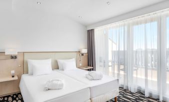 As a family of 3 adults, we drove down for a 3 night stay. We chose this property as it was adjacent to the Thermal Spa. Our package had breakfast, lunch, snacks and dinner as well as alcohol included. Our 2 rooms were on the 4th floor facing the reception area. Upon arrival, our check in was quick, and we had a handicapped person in our group, and with 2 handicapped parking spots right in front of the hotel, it made it easier to reach the entrance. There is nothing negative I can say about the hotel, aside from that we will not choose an all inclusive package again as it is really not needed. Now as far as the spa in concerned, I will write a separate review on their site as that has nothing to do with the hotel. We did find it very convenient to be able to walk in our robes directly to the spa itself. The hotel also in a good location to walk to the grocery store Lidl (9 minutes) as well as the castle and the town (about 12 minutes).