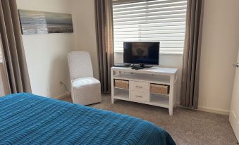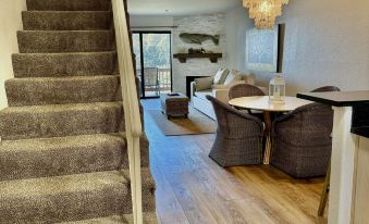 On the first floor: Fully stocked kitchen with full size appliances (in case you feel like cooking) the dining area is large enough to comfortably seat 6, plus a breakfast bar with 2 bar stools, a corner gas burning fireplace to cozy up to, a comfortable queen size sofa sleeper, flat screen Smart TV, (use Aps) and free Wi-Fi access, a Blue-tooth stereo player so you can connect to Pandora or your favorite music and listen thru built in ceiling speakers. plus a new Weber BBQ. and 1/2 bath.
