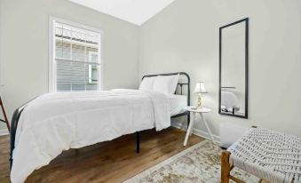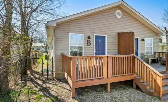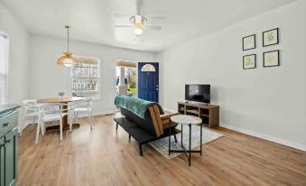 Enjoy this renovated duplex unit B bungalow with modern amenities including a private deck cool cotton bedding, Roku TVs, a full kitchen, a washer & dryer in the unit, and self-check-in.