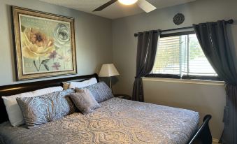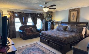 The Master Suite Boasts a Large Bedroom, with a King Size Bed and a Full Bath and Shower. It is located at the back of the home, for extra added privacy.