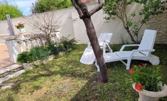 Upstairs, equipped with recent reversible air-conditioning, a living and dining room (55 m2) and 2 bedrooms, 1 bathroom, 1 separate WC with a large, well-equipped kitchen opening onto a 44 m² covered tiled terrace facing east. Situated 1.2 km from the center of St Georges de Didonne and its magnificent 5km beach, next to Royan beach, and close to a small park with a lake and a supermarket (3 minutes' walk), this spacious villa enjoys absolute peace and quietness, as it is located in a large pavilion cul-de-sac, with another small park very close by. The town center offers many shops (3 bakeries , 2 pharmacists) and a daily open market . 2 balconies to the south and north-west. 6 bedrooms: 1 upstairs bedroom (1 x 160cm x 190 cm bed), 1 upstairs bedroom (140x190cm bed) with small desk, 3 ground floor bedrooms (3 x 140cm beds) including a master suite, a small ground floor living room with 1 x 3-seater convertible sofa with comfortable mattress (140cm and 17cm thick), 2nd equipped ground floor kitchen, 3 shower rooms including an Italian-style