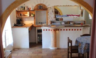 The 1½ room house can accommodate up to two people. It consists of a living room with a double bed (1. 60 x 2m), a sitting area with an open fireplace, as well as satellite TV and music player. The adjoining American kitchen is well equipped and offers a cozy dining area. There is a bathroom / toilet. Mobile air conditioning and WiFi are standard equipment. Parking spaces are available for our holiday guests directly at the house.