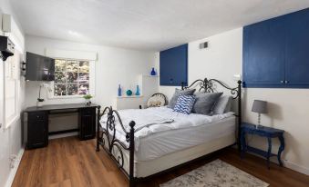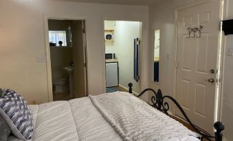 This studio guest house hideaway is set in the midst of the gardens with a private separate entrance just steps away from the tranquility of nature. The interior has all of the comforts of home along with the wilderness just outside for inspiration & creativity. Located on the lower level of the main house, it is accessed via a side walkway that guides you to the private brick-covered porch. Equipped with a kitchenette, en-suite bathroom, & workspace you are ready to live, work, & play in nature.