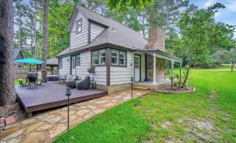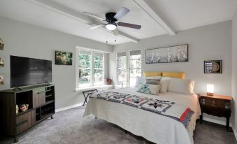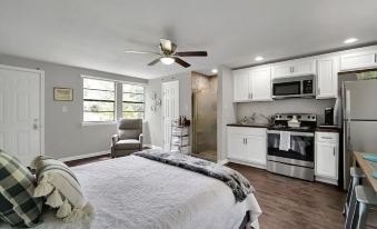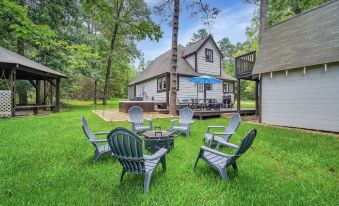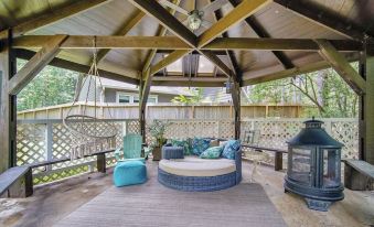 Our little cottage sits on a serene double lot with lots of privacy in a gated community. The main cottage has 2 bedrooms with a hall-accessed full bath and an open loft upstairs with its own bathroom, twin bed and sofa. Above the garage is a cute studio with a full bath and its own kitchenette. Bedrooms are comfortable with a king size bed in one and queen size in the other, including smart tvs. The kitchen is fully stocked along with a well-appointed coffee and tea bar. Think cozy NYC size kitchen in the main cottage but it has everything a cook needs to prepare meals along with a vast open backyard area with grill, picnic table, deck and covered pavilion for gathering. Gaze at the stars in the night sky while soaking in the hot tub* or enjoy a fire at either the gazebo fireplace or the central fire pit at night!