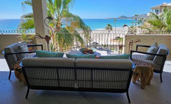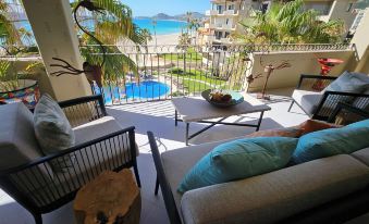 The perfect beachfront luxury 2 bedroom / 2 bathroom property with mesmerizing water views and the incessant sound of rolling waves making their way ashore. Located in the exclusive El Zalate community, an enclave of 4 buildings nestled so close to the water you can almost jump in - directly facing the Sea of Cortez. Once you pass the guarded gate, you will immediately be transported to a tranquil oasis replete with pristine, manicured grounds, 2 grand swimming pools, a hot tub, as well as direct beach access. Each building in this small complex is only 6 floors high, with just 3 units per floor. Our 5th floor unit features a spacious patio with unobstructed water views, truly as far as the eyes can see. The interior has been professionally decorated with an eclectic, artistic and fun style throughout. Enjoy a generous living area, relax in the comfortable queen size beds fit with luxury linens, watch the Smart TVs in every room, prepare delicious refreshments in the fully-equipped kitchen. And if you have 2 extra guests, there is also a queen-size sofa bed in the living room. Ideal for an extended weekend or an even longer escape in the peaceful Los Cabos area – a must-experience destination!