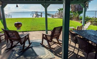 This perfect waterfront bayhouse has been family-kept since the 1950s. Fully re-built in 2009 after Ike, it is a great location for a fishing weekend. The open front family room has a large couch, relaxing chair, and a futon; along with large dining room, and huge updated kitchen. The back rooms includes 4 bed; 1 double and 1 single bed in Room #1, and 2 single beds in Room #2. Two Pristine bathrooms inside, along with one inside and one outside shower.About pets:Pets allowed: less than 50 lbs per pet (limit 3 pets total).About checkOut:Flexible check-out available (contact host to arrange).About children:Children allowed: ages 0-17.About checkIn:Flexible check-in available (contact host in advance of arrival).About smoking:Smoking allowed: in designated areas.Smoking Outside.About minBookingAge:Minimum age to rent: 18.About events:No events allowed.