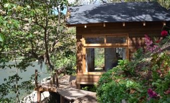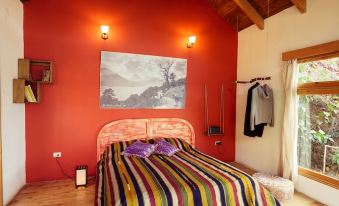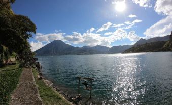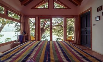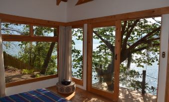 Tree house style cabin surrounded by gardens, located right on the lakeside with spectacular view of the Lake, volcanoes & mountains. This peaceful and lovely cabin is ideal for couples or friends to stay and relax. One bedroom with queen size bed, quality linens and luxurious private outdoor bathroom with deluxe shower.