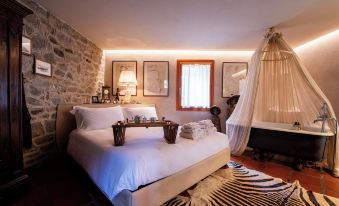 Hotel di rara concezione, praticamente una dimora con personale di servizio. Ambienti incredibilmente affascinanti, dal carattere antico, lussuoso, ricercato. Ogni ambiente è una sorpresa, dalla hall ai banconi dei bar, alla cucina, alla sala giochi, tutto un susseguirsi di piacevoli sorprese, oggetti antichi, ricordi, storia. Abbiamo dormito nella Suite America, ambienti ricchissimi di oggetti, camera confortevole, con camino, balcone sulle montagne, chiusure finestre elettriche, lampade e prese ovunque. Sala e salotto ampi, con enorme camino, tavolo per 8 persone, molto luminoso, comodo, con particolare accesso diretto tramite scala alla sala ristorante nel piano di sotto. Bagno grande con vasca e doccia, doppio lavandino, molto curato con ottima biancheria, accessori bagno, luci, candele, tutto fantastico.