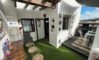 Attic: The third floor features an attic with two single beds, workstations with two 24-inch monitors, a drinks patio with a bar table and ample seating, and an outdoor grill with dining for 8 people. The chill-out area offers stunning views of the Rock of Gibraltar.