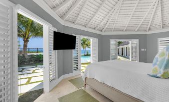 Bedrooms 2 & 3 have desks, and the Primary bedroom has a private sitting room, with a a desk, sectional sofa and a TV. The sitting room is just feet from the the ocean, with louvered windows on three sides. The waves lull guests to sleep at night, but sliding doors can close the sitting area off from the bedroom, if desired. The sitting room is also a great location for an in-home seaside massage, arranged by our butler, through the Tryall Spa.