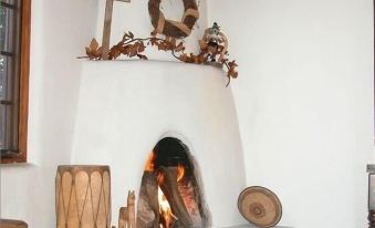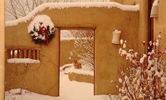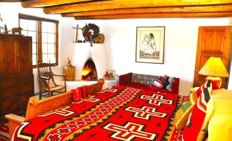 The Guest House on the Hill is on two and a half acres with the owners' home in rural Tesuque, just five minutes from historic downtown Santa Fe, New Mexico. It has a living room with three French doors and an adobe-walled patio, both looking out over the Tesuque Valley to Santa Fe Baldy, Tesuque Peak, and the Santa Fe Ski Basin. There is a large master bedroom with a fireplace and king-size bed, a second bedroom with a queen-sized bed, a sofa bed in the living room, and a fully equipped kitchen.