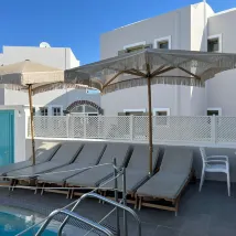 Ottimo hotel, pulito e curato nei particolari. Le camere sono ampie, una di queste aveva un soggiorno con grande divano e televisore e poi la camera anch'essa di grandi dimensioni, l'altra camera aveva un salotto con poltrone e letto di grande dimensioni, con effetti di luci cromatiche, fornite di bollitore, frigo, phon e numerose prese elettriche e prese usb, aria condizionata, tutto perfettamente funzionante, probabilmente ristrutturato da poco. Un poco piccolo il bagno con doccia aperta, quindi bisogna prestare attenzione per non allagarlo. All'esterno terrazzino con tavolo e sedie. Abbiamo anche usufruito della colazione à la carte, varia e buona con diversi prodotti dolci e salati. Personale gentile e disponibile, efficiente ed attenta la signora responsabile sempre pronta per un consiglio o un aiuto. A pochi metri è presente la fermata dell'autobus di Karterados per le spiagge, l'aeroporto e il centro città, anche se quest'ultima raggiungibile a piedi in circa 20 minuti. Visti i prezzi di Santorini mi sento di dire che il rapporto qualità prezzo è ottimo.