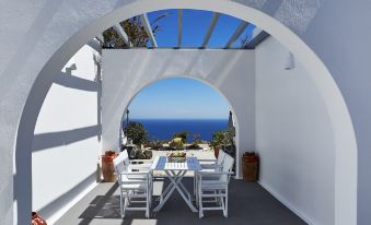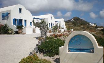 Certo arrivare a tarda notte, trovando peraltro in modo facile e comodo questa bellissima location, e svegliarsi al mattino con il sole, aprire la porta, apprezzare la struttura ed avere davanti panorama del genere, è già un ottimo inizio. Non sarà la vista caldera, ma anche il lato esterno ha il suo perchè. Definirla "camera" è riduttivo, le camere standard sono dei veri e propri mini alloggi con spazio privato fronte mare ma anche sul vialetto interno, con la zona giorno, minibar, guardaroba e bagno al piano terra ed il letto su un soppalco, molto molto pulito, carino in puro stile cicladico. Nataly e suo papà sono stati molto presenti ma altrettanto discreti, cortesi ed attenti ad accoglierci al mattino dell'arrivo (e tutte le mattine seguenti), chiedendoci cosa desideravamo per colazione. Ottima ed abbondante. Avevo specificato nei giorni precedenti all'arrivo che la mia dolce metà è intollerante al glutine, si sono fatti spiegare meglio di persona la situazione e dal giorno seguente hanno avuto molta attenzione e ampia proposta anche su questo. Grazie! Per il resto, leggendo anche le recensioni precedenti, condivido l'osservazione che l'ubicazione necessiti di un mezzo per muoversi (ma vale in generale per tutta l'isola, a mio avviso). Noi avevamo noleggiato un'auto e le riteniamo una scelta vincente perché la posizione nell'isola permette di arrivare ovunque in pochissimo tempo. Sicuramente torneremo su questa fantastica isola, e probabilmente lo faremo nuovamente qui.