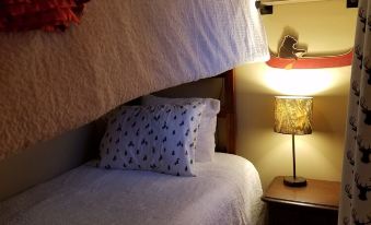 The bedroom has twin bunkbeds and there's a full-size sleeper sofa in the living room.