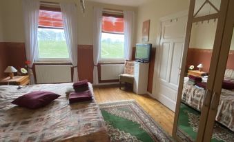 The apartment is freshly renovated (Oct. 2023) offers cozy living comfort with plenty of space. Through a separate entrance you enter the large hallway lined with terrazzo from which the 2 spacious bedrooms , 1 children's room and the full bathroom with shower tub and the rustic with solid wood furniture equipped and well-equipped kitchen depart. 2 of the bedrooms as well as the clock cozy living room equipped with its own fireplace offer direct views of the surrounding fields. The design of the interiors give the apartment a rustic coziness. In addition to washing machine, an extra sofa bed, radio, books and LED TV, the apartment has a fiber optic connection, so fast internet is provided.