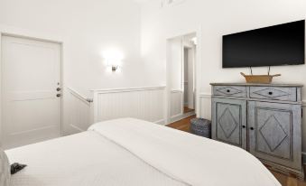 -2nd Floor Queen Suite - TV, private covered balcony with ceiling fan and lounge chairs, dresser storage, ensuite bath with combination shower/tub. Note that this suite encompasses the entire 2nd floor and there is no door shutting it off from 1st floor