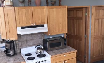 In the kitchen, you will find a refrigerator, oven/stove, coffee maker, and microwave. The cabinets are filled with all the dishes and equipment you may need during your stay. We stock coffee and some pantry items to get you started. The bathroom includes all the necessities and a few extras. It has a shower only, no bathtub.