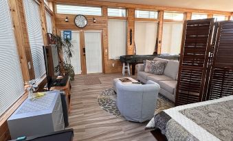 Our studio has tall ceilings and big windows making it light & bright. It has a queen sized bed, allowing for a maximum of 2 adults in a studio setting. The studio is especially great for one couple. There is a 42” smart tv and a desk where you can set up your laptop to take advantage of our high-speed wireless internet. In addition to a closet full of games, there is also a pinball machine and shuffle board for you to use.