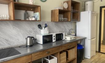 There is a shared kitchen equipped with a stove, kettle, dishes, microwave, refrigerator. There is also a TV in the kitchen.