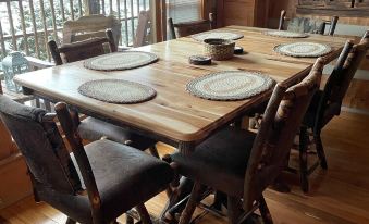 Just steps from the kitchen is a dining nook with a table set for 6, and a giant window, so you can enjoy breakfast, lunch or dinner with mountain views.