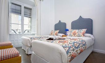 First Bedroom: Two single beds, a spacious wardrobe, and practical details like stools that add both functionality and style.