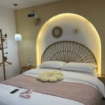 Servizi: La stanza è completamente attrezzata con asciugacapelli, acqua potabile, specchio per il trucco, pantofole e proiettore. È molto suggestivo guardare un film o ascoltare musica di notte. Anche le condizioni igieniche sono molto buone. Le lenzuola e le trapunte sono molto pulite e il letto è molto comodo. Puoi dormire sonni tranquilli.