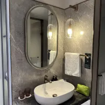 L'esperienza complessiva non è buona come previsto. Ad esempio, il lavandino è solo una piccola lavagna, che non può contenere molte cose. Non c'è separazione tra asciutto e bagnato. Il vapore acqueo può facilmente penetrare nella stanza molto fioco e non puoi nemmeno vedere chiaramente durante la rasatura. La cosa più terribile è che il design del bagno e della toilette è molto stretto e buio, il che fa sentire le persone depresse e a disagio Nel complesso, ha un certo senso del design ma il l'esperienza di vita effettiva è nella media. Spero che possa essere migliorata la prossima volta.