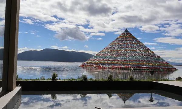 人間仙境,野墅的窗外緊靠着清澈明亮的納帕海,減弱的微風拂過,泛起一圈圈漣漪,經幡倒映在海面,陽光灑下時金光耀眼,每天,躺在露台或躺在床上喝杯茶,聽着音樂看着書,好自在~