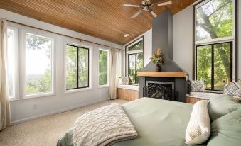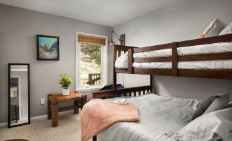 - Primary Suite: Private two-room suite with skylights, a seating room, upper balcony access, a memory foam king bed, gas fireplace, windows overlooking the mountain, and a completely renovated bathroom with a new walk-in shower.