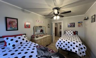 The big bedroom has a king bed and couch (w/ TV), the smaller room has two twin beds. We do have a blow up mattress for anyone needing an extra place to sleep.