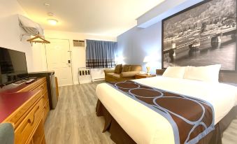 The parking lot is convenient but also quite busy. The rooms were average but very clean, very comfortable beds and pillows. No microwave in rooms but very roomy mini fridge. Basic tv, not a smart tv that we could connect to but that was ok as we didn't spend much time in the room. Steps away (shared parking lot, which might be why it was so busy) with the best restaurant/pub in town, moose mulligans, and a short walk down to the marina/water. The breakfast that is included is very minimal (bread, bagels, cereal, yogurt) coffee and tea, but that's ok we weren't expecting much more. Everything is in walking distance (beach, restaurants, mini golf, distillery, ice cream, food trucks). Very very minimal housekeeping was provided, but we didn't mind. Front desk staff was very friendly and helpful. Overall we had an amazing stay and will be coming back here again. Thank you, super 8 sicamous.