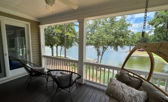 The open concept continues to the upstairs dinning area which is spacious and perfect for casual or formal meals any time of the day. Both a dinning room table and chairs are available, as are bar stools for the kitchen counter eating space. Beyond the dinning area, is the upstairs living room which features a wrap-around sofa, as well as other seating, and features a 65-inch wall mounted television. The views of Lake Oconee from inside the upstairs living room, as well as from the attached balcony are unmatched with sunsets and sunrises not to be believed. The upstairs balcony, which is accessed through French doors, features seating including a swing loveseat perfect for relaxing with open views of the lake at all times of day. A more beautiful way to drink coffee in the morning is hard to find.