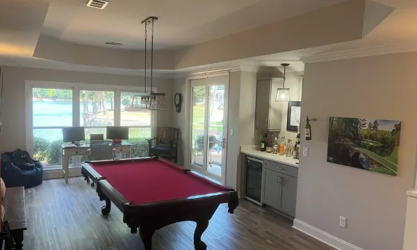 Taking a walk down the stairs to the first level, you will be stunned by the large main room featuring a standard-sized red-felt pool table, wine/beer fridge, dry bar, 55-inch wall mounted TV, and stunning lake views. This room also has a full "office" set-up with a large powered desk with duel monitors facing an exquisite view of the lake. There are billiards sticks for adults and children, as well as everything else needed for fun games of pool while watching sporting events and enjoying a drink!