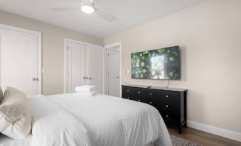 All FIVE bedrooms feature clean designs and comfortable Queen-sized beds. Additional amenities include makeup towels, body wash/shampoo/conditioner by Puracy and Public Goods, hair dryer, and clothes steamer.