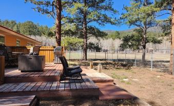 The back deck/patio: has been newly painted. There is a stainless steel propane grill with grilling accessories and a standalone propane fire pit. Also, Patio table/4 chairs and two low chairs and side table. The yard is fenced in closely with metal fencing. Our property extends past the fence and is a treed lot.