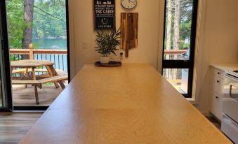 Our lake house offers 1300 sqft. of bright open living space. The kitchen has all basic amenities, as well as a 10ft island for ample workspace, and a farmhouse table that seats 10. Enjoy making and sharing your meals while overlooking the lake via the patio slider.