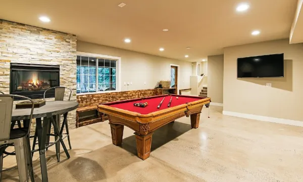 Downstairs is centered around a game room with pool table, bar pub table top, fireplace, flat screen TV...