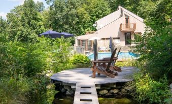 Great spot! Very peaceful property and unique house. The proximity of the house to the pool and hot tub was great since it was so close. Slept two families of five comfortably with a little creativity. Also took the MetroNorth train to the city one day which was easy too. Highly recommend!