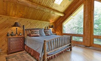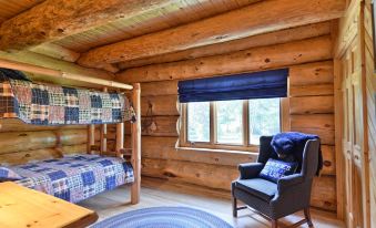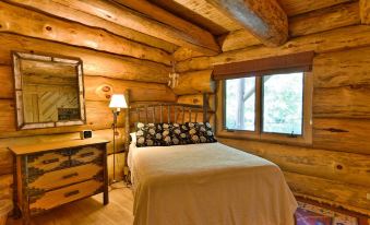 The great room has a large gas fireplace, custom Old Hickory furniture, cable TV, wireless high speed internet and a DVD player. Windows facing the lake extend two stories for fabulous views of the lake and surrounding woods. Old Hickory and antique furniture is inter-mixed with comfortable seating throughout the first floor. Off of the great room is a sunny all season porch facing the lake with two story windows on three sides. It is truly a spectacular room and a favorite of our guests. The main floor has 2 charming bedrooms, one with a bunk bed, and the other a double. Both rooms are furnished with handmade log furniture and wool throw rugs. Out the back door is a deck, which is a nice spot for viewing the lake while sipping morning coffee or an evening drink. Seating is provided at a comfortable dining table with an umbrella.