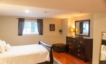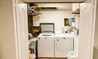 Featuring five bedrooms (One is a baby's room with a crib) and two full bathrooms, including a bathtub upstairs and a convenient stand-up shower downstairs, our home boasts comfort and convenience. Downstairs, a washer and dryer stand ready for guest use, ensuring your stay is as effortless as possible.