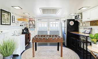 Our Main Floor Level At The Shoe House Boasts a Leather Sectional, Game Area w/ Foosball/Board Games, a Second Fridge and Coffee Station, as well as Direct Access To Our Backyard Hot Tub.