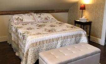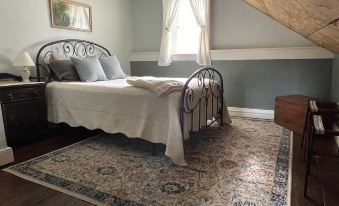 This is a sweet cottage away from the hustle and bustle. It is situated on a corner and affords a beautiful view of farmland and sunrises/sunsets. The bedrooms and bathroom are all located upstairs. We loved the beams and antique furniture. There’s a griddle in the kitchen that makes cooking breakfast easy. We appreciated the air conditioning.