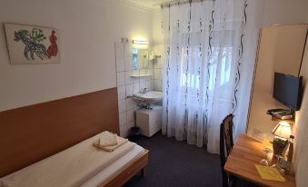 di positivo la posizione, per chi e' interessato alla festa della birra, perche situato a 4 minuti a piedi, i negativo l'assenza totale del personale, in orario di cheek.in dichiarato aperto, l'hotel era chiuso, siamo entrati solo dopo una telefonata ad un numero scritto sulla porta. Personale assente anche al cheek .out(chiavi lasciate in cestino davanti all' uscita). Camere piccole con tv non funzionante, ma pulite e prezzo interessante.