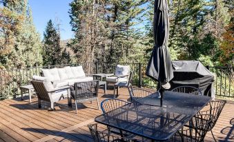The home is filled with tall windows for gorgeous lighting and views. The outdoor balcony is the perfect place to enjoy a meal in the fresh mountain air.