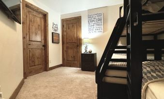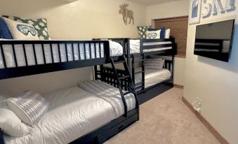 On the lower level you will find two additional bedrooms, full bathroom and secondary living space. Our super fun bunk room has a twin over full & a twin over twin bunk beds, 60" smart TV and large walk in closet with tucked away games/toys for the kids (& kids at heart!) The luxurious king guest room also boasts Frette linens, large walk in closet, 65" smart TV and beautiful views out the north facing picture window. A secondary living room features a large 65" smart TV, an on demand electric fireplace/heater, X-box, games, puzzles, etc. A separate desk/workstation and private walk out patio rounds out this spacious lower level. This flexible space is nice for a kid's movie/game night, or can offer a quiet place to get some work done remotely.